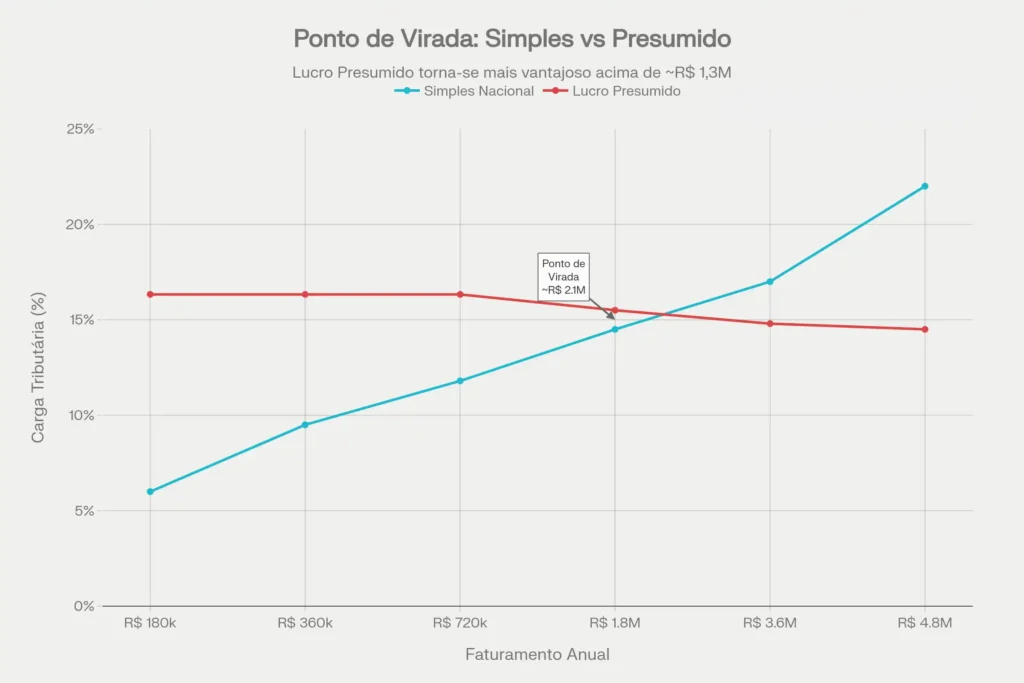 Gráfico: Visualização do momento em que o custo do Simples Nacional ultrapassa o do Lucro Presumido, indicando a hora certa de migrar.